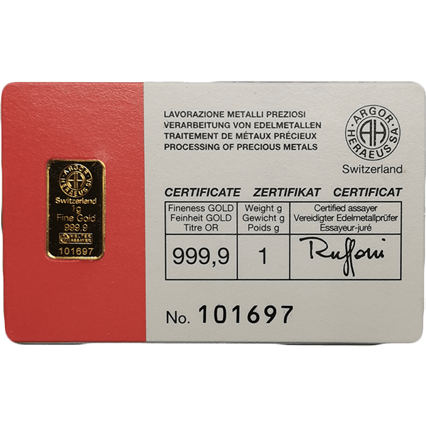1 g AU Investiční slitek Argor Heraeus 1G-A-AH